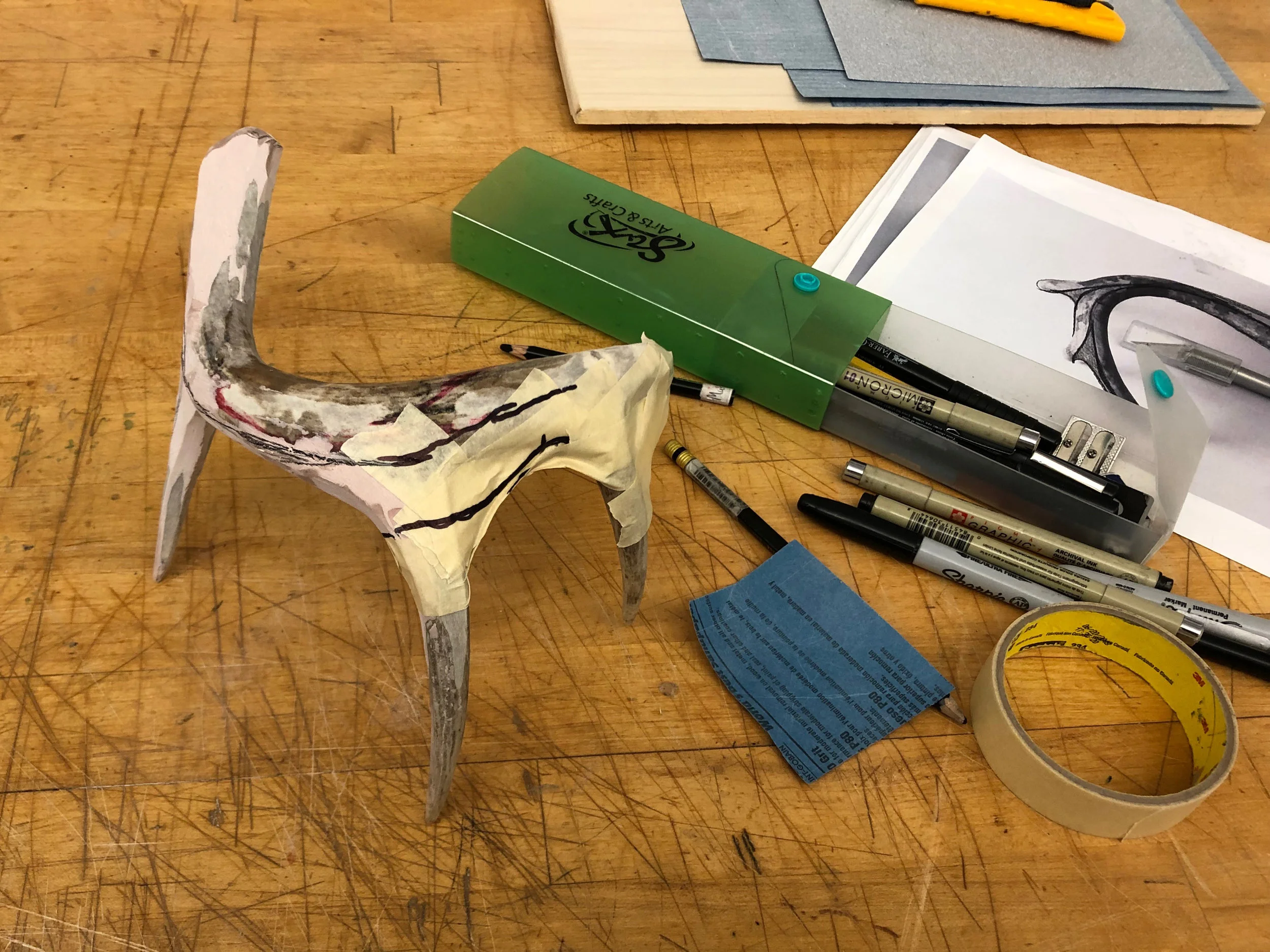 After sketching I began to interact and empathize more with the antler, letting it communicate to me what it should become. I spent time picking it up different ways and tracing outlines of my hand onto it. I also used tape to simulate additive alterations before applying Bondo—a thick, two-part polyester resin—to the back end of the form.